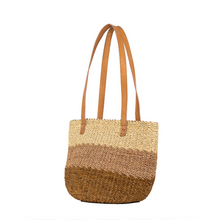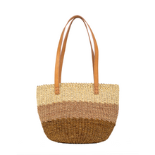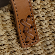 Handwoven raffia bag with leather handles. Linen lined interior with drawstring closure and interior pocket - the perfect beach to street bag.