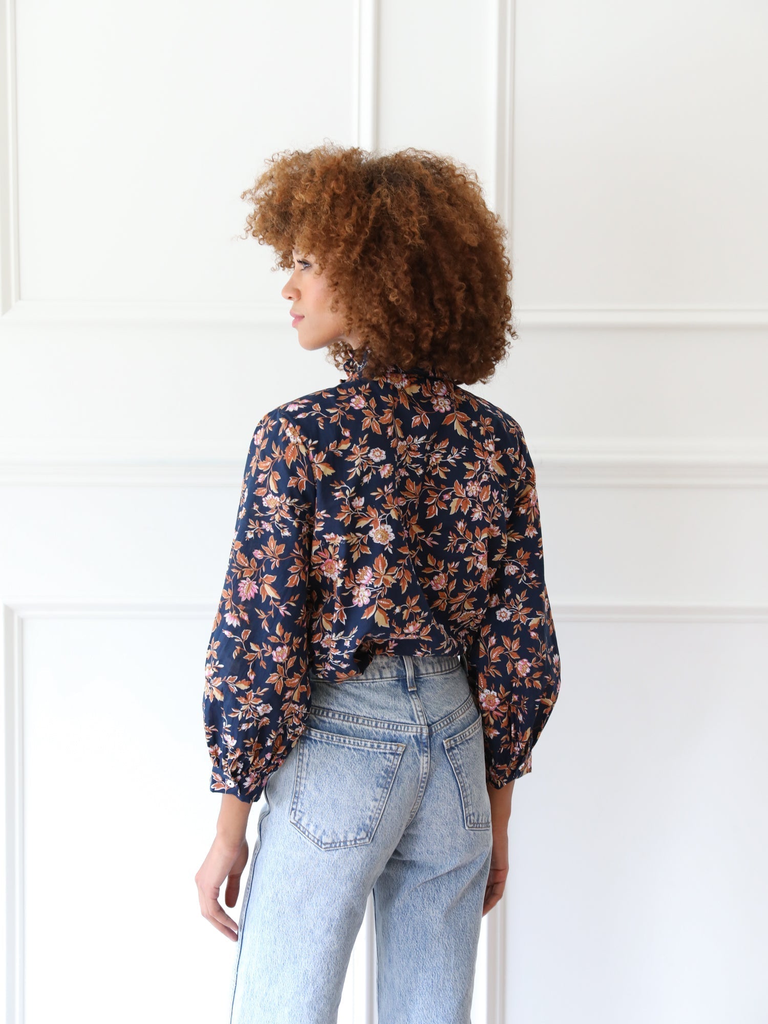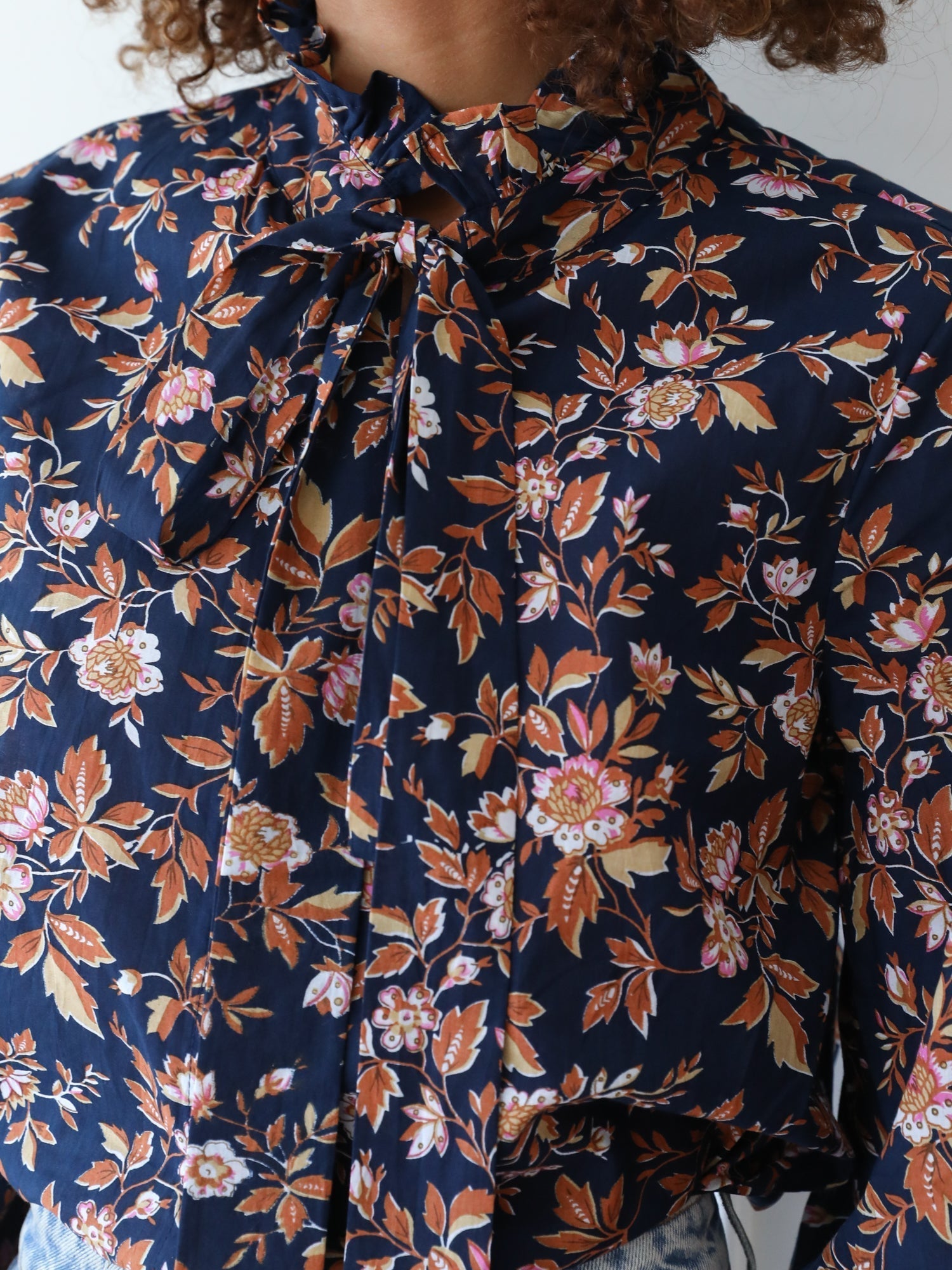 Bonjour Blair! Our newest tie-neck blouse is made of 100% cotton in an exclusive fall floral print that is sure to become a wardrobe staple. Button down front with a slim tie in place of a top button. Subtle ruffle at the neckline with button cuff and a loose fit through the body. From work to play, Blair has you covered. Wash separately in cold water and hang to dry. Available in Montmartre.