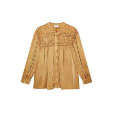 It's been a while we don't work with viscose 'Modal Satin', and decided to make a comeback this season in a distressed hue rather than on a print. The button-up, collarless blouse features a double smocking design, pin-tucked back and shoulders, and slight oversize sleeves.