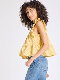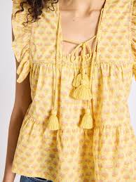 Our Chelsea top has a universally flattering fit. Slightly cropped with a little swing through the body and a wide ruffle hem. Narrow, square neckline with tassel ties and a pleated ruffle along the shoulder opening.