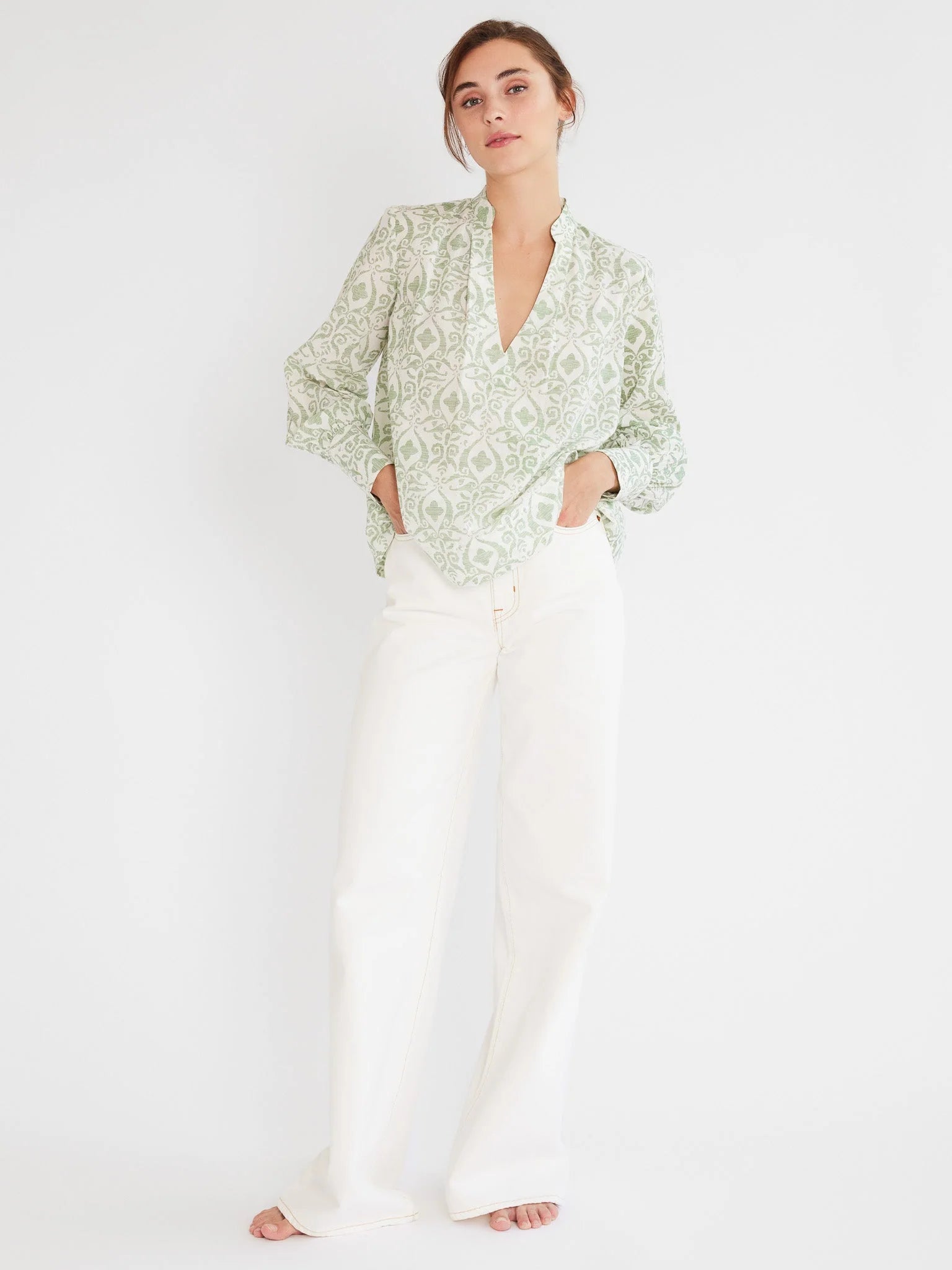 Clean lines with an easy fit and make the Freya top a study in simplicity. Loose body with notch collar, deep v neck and an elegant fitted cuff that fastens with four fabric covered buttons.