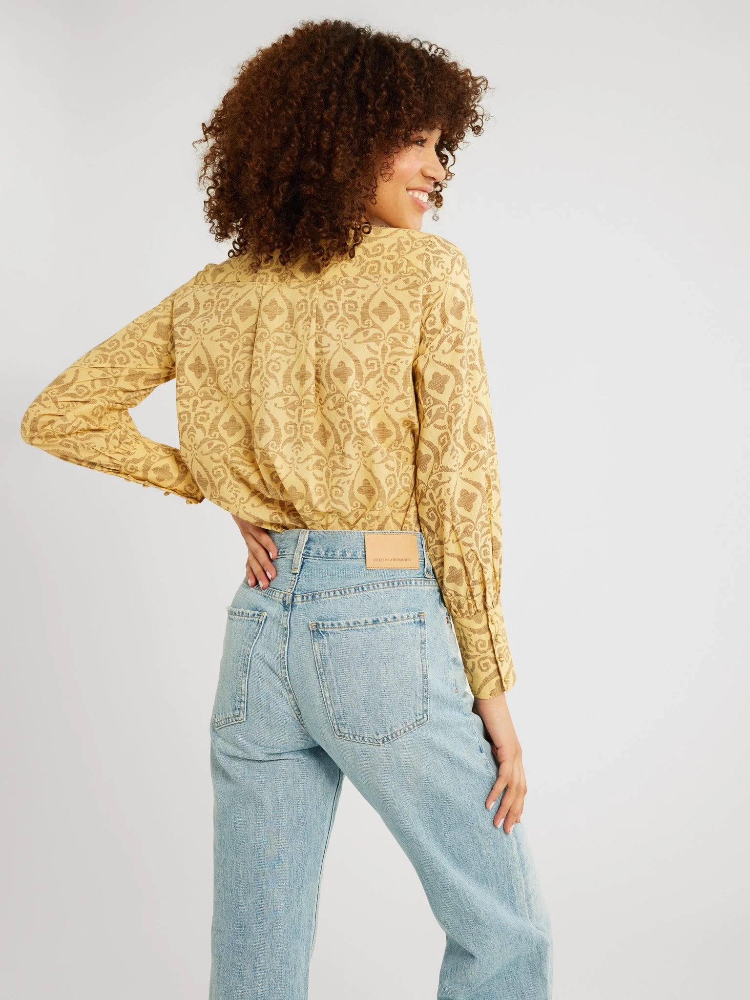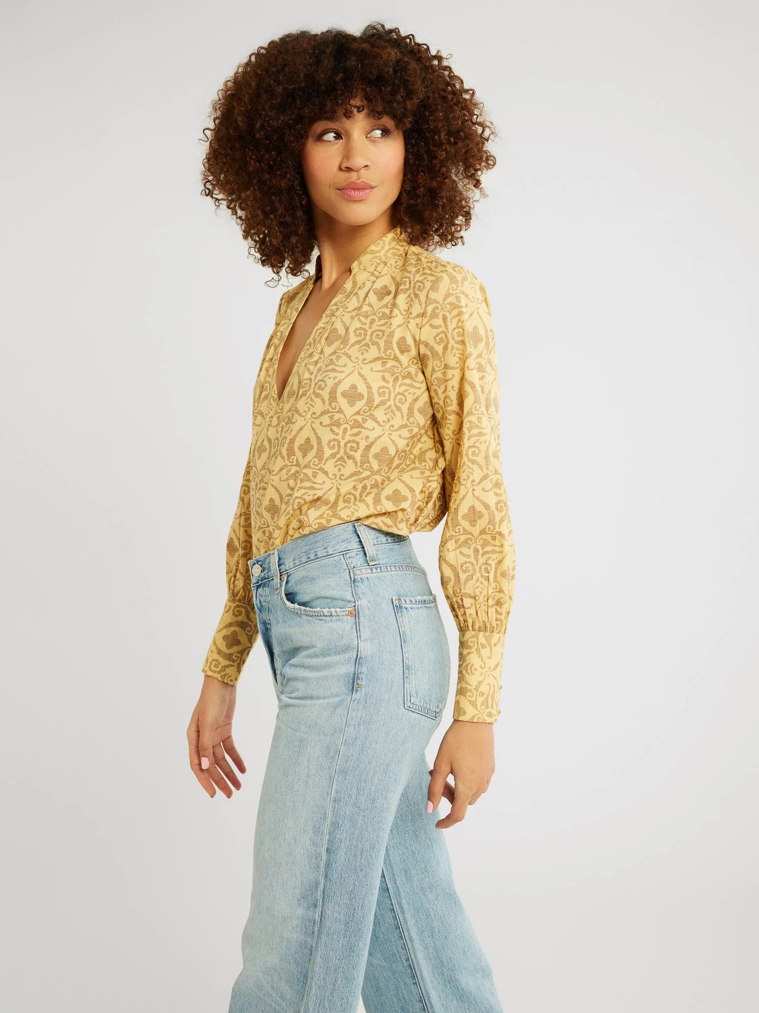 Clean lines with an easy fit and make the Freya top a study in simplicity. Loose body with notch collar, deep v neck and an elegant fitted cuff that fastens with four fabric covered buttons.