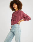 Keaton is a long sleeve, collarless tunic blouse with a delicately pleated tuxedo style front. Button down styling with hidden placket. Three buttons at the cuff and a slightly longer rounded hem at the back. Simultaneously relaxed and polished.
