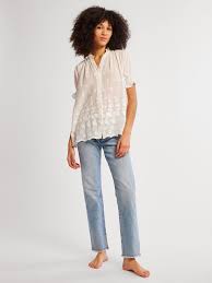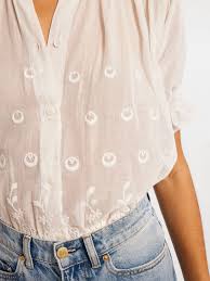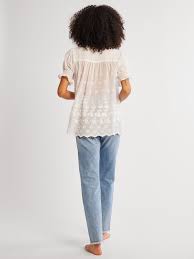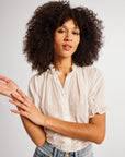 The Marnie button down blouse features a short sleeve with a smocked elastic cuff and a delicate ruffle detail along the neckline. Feminine embroidery throughout.