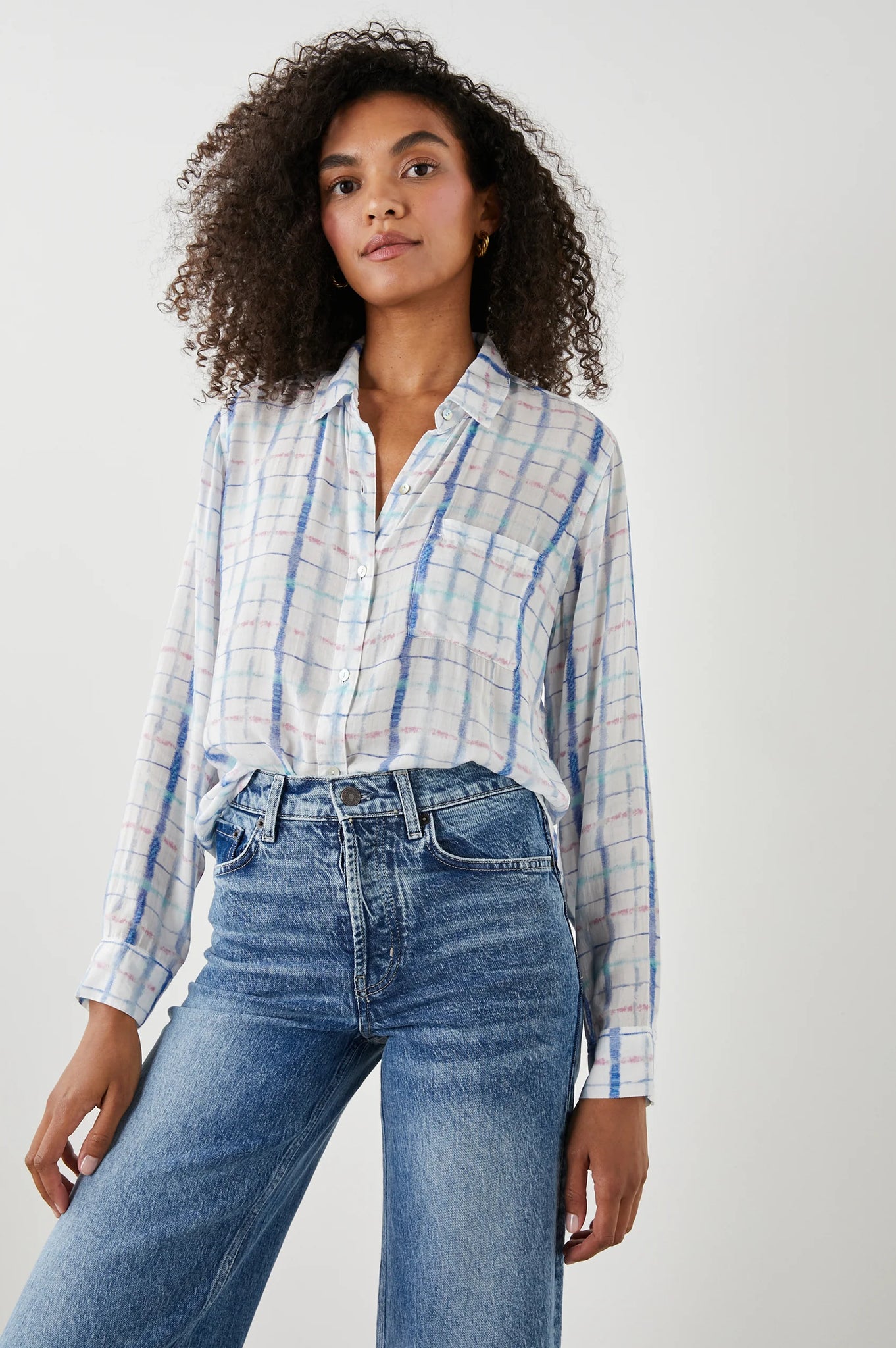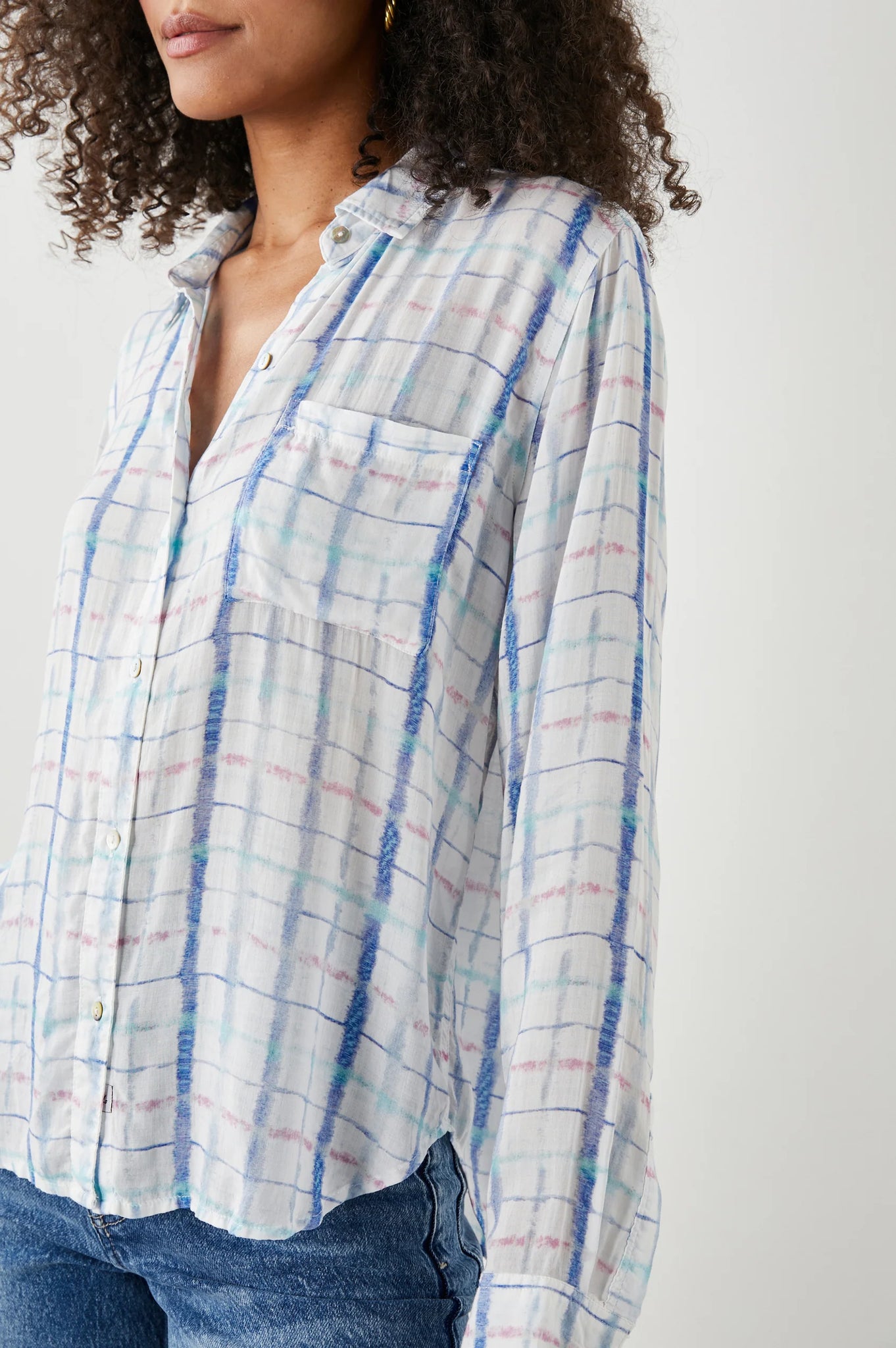 Our super soft, best-selling shirt is back in a unique blue, turquoise, and pink grid print. Made from lightweight, feather soft rayon, this button-down shirt features a single patch pocket at chest, classic fit, and natural shell buttons.