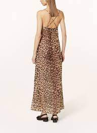 This ankle-length slip dress features thin, adjustable straps that cross in the back and a zip closure at the side. Available in brown leopard.