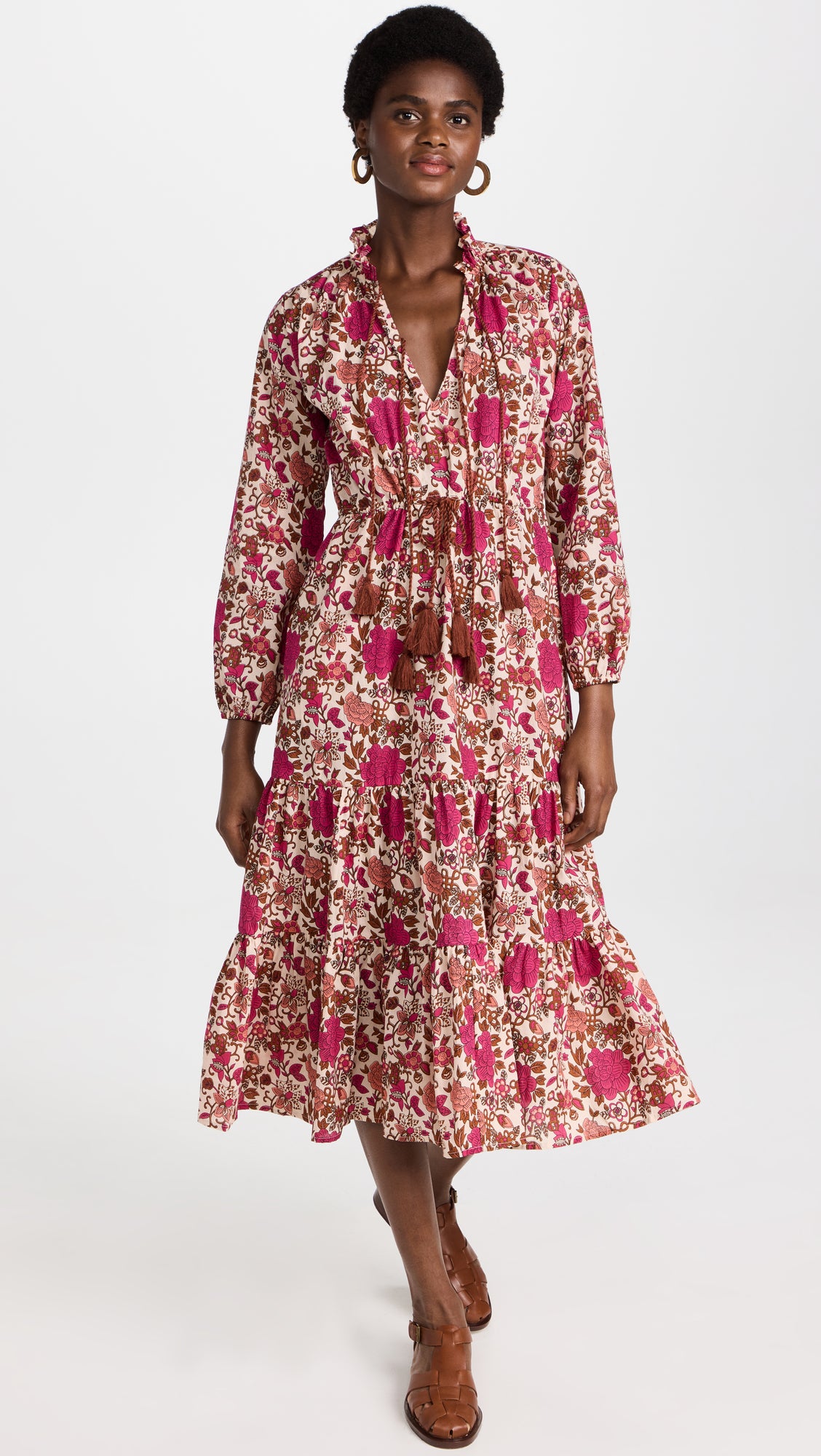 The Astrid dress is en easy and effortless shape. Made in soft block printed cotton with a tassel drawstring waist and ruffled neckline with tassels, the Astrid dress transitions perfectly from boots to sandals.