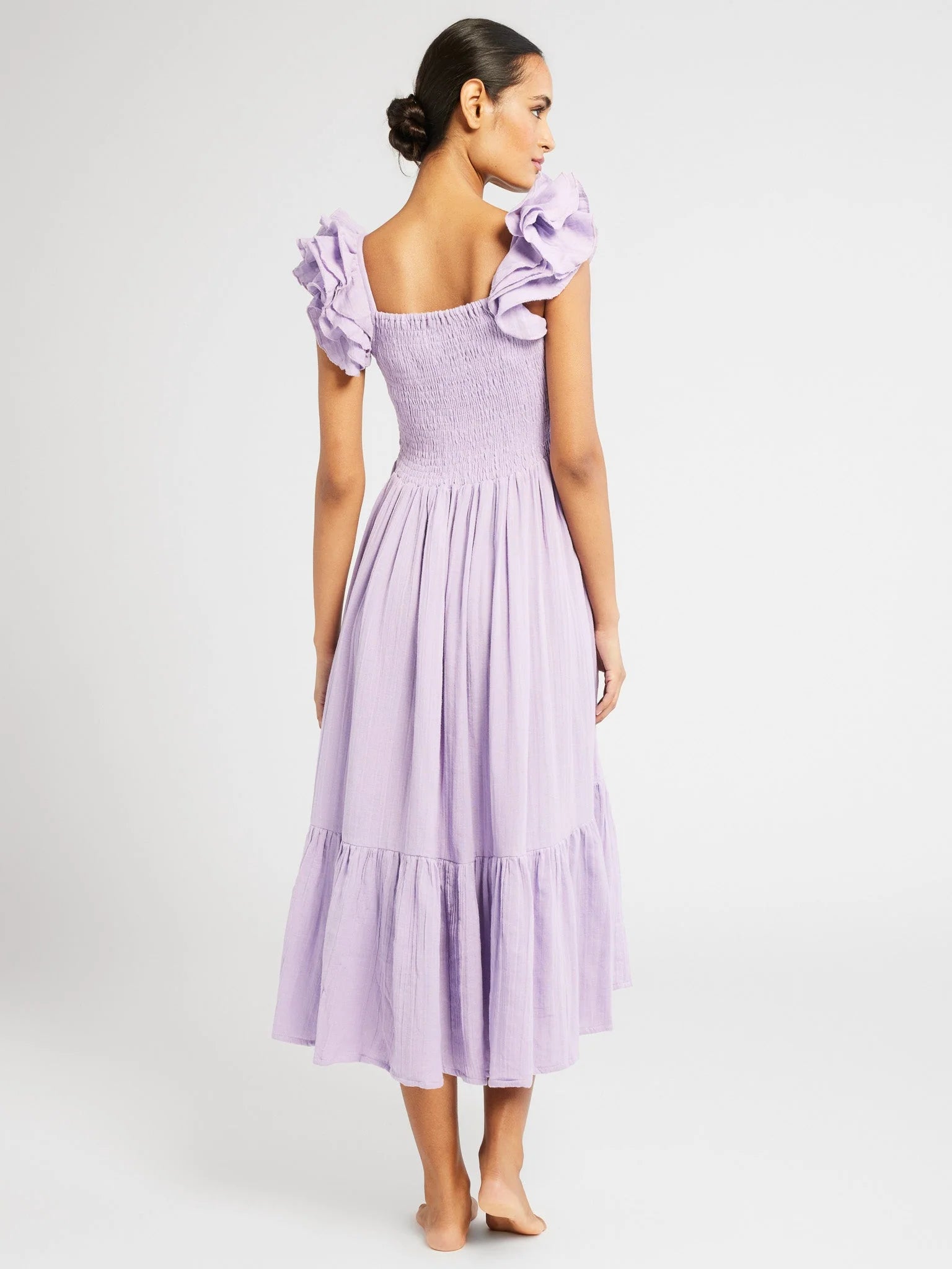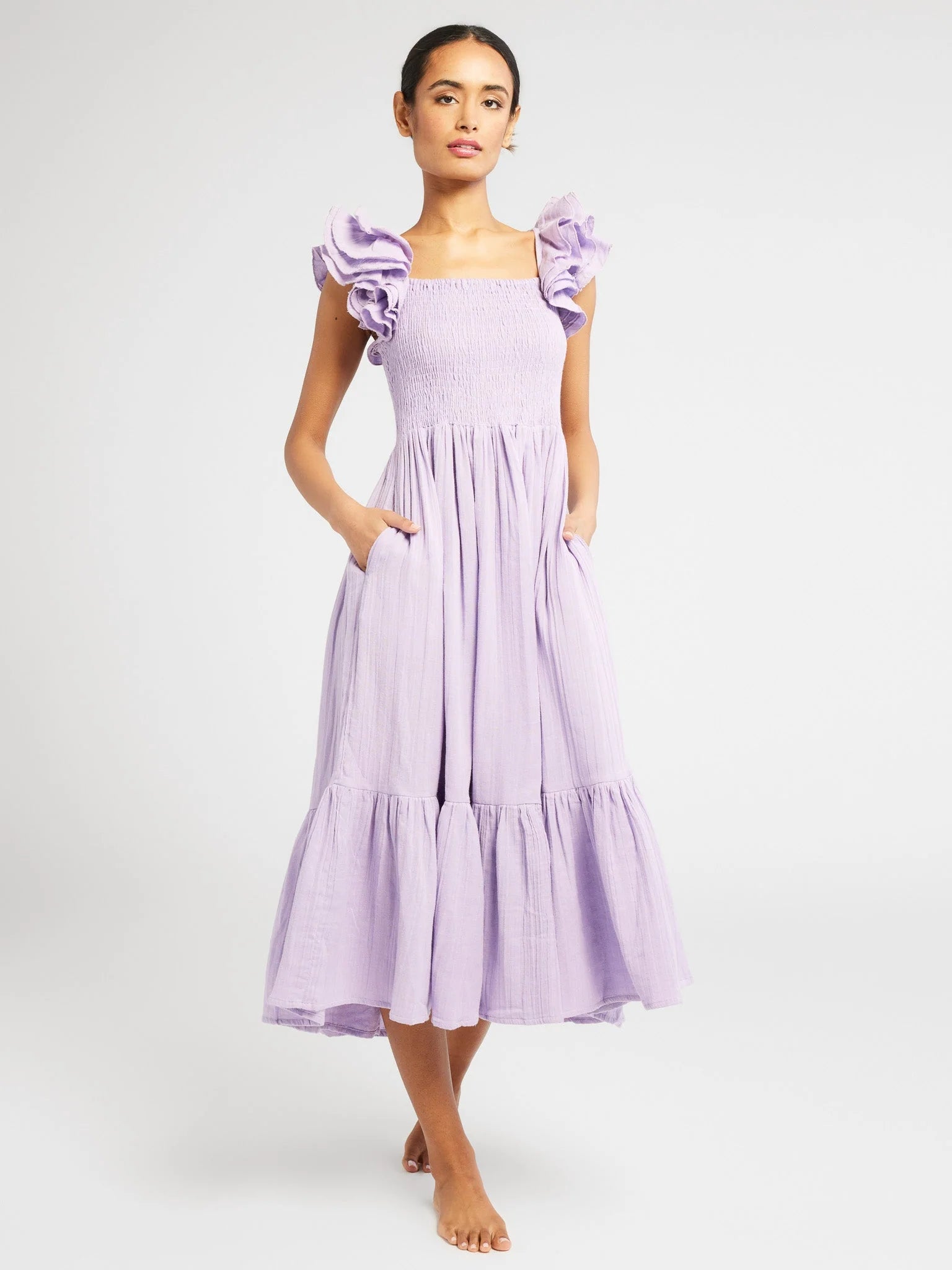 Easy pullover style with a smocked bodice framed by layered ruffled sleeves and a full skirt with tiered hemline and pockets. Perfect for summer days (and nights!), warm-weather locations and vacations.