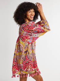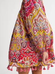 Vida is a mini dress with flair. Oversized through the body with smocking at the neckline and voluminous long sleeves with elasticized cuffs. Dress is double layered with the longer skirt hemline finished in pretty pink tassels. Pullover styling with pockets.