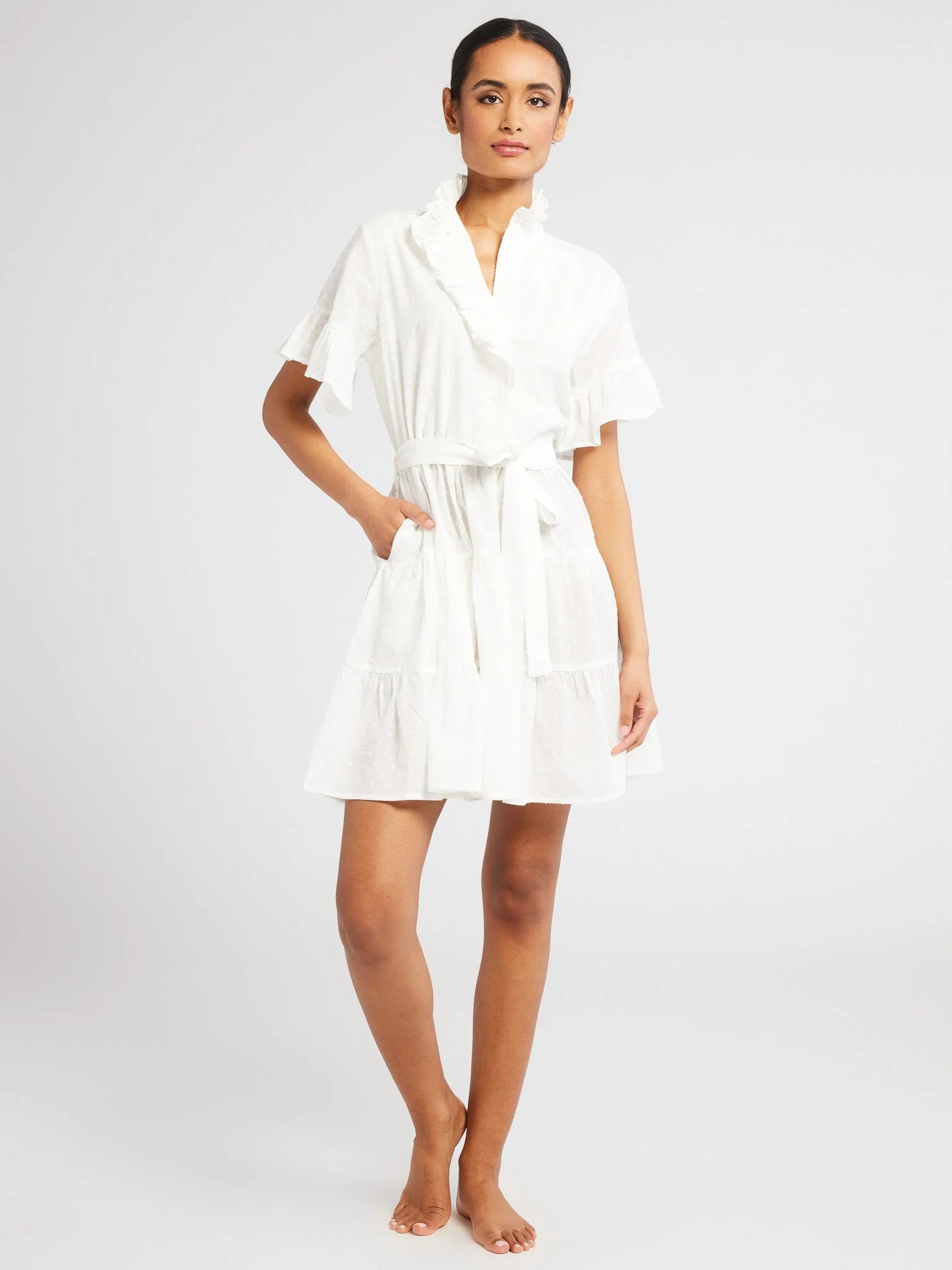 , a mini version of our favorite Victoria dress. Easy tiered, flowy skirt, belted waist and pockets. Button down top with ruffle placket and sleeve detail. Soft cotton, made with love in Jaipur.