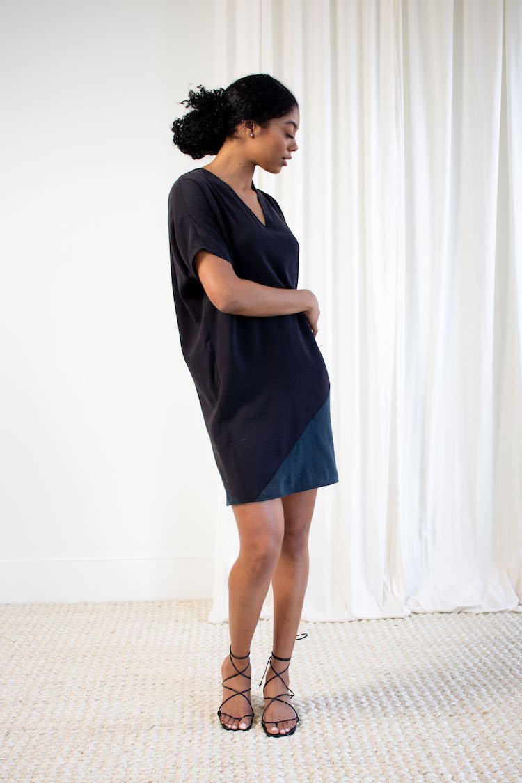 A little update to your little black dress. We've combined our black and pacific tencel viscose for a color block effect on this elegant dress silhouette. The fit is somewhat shapeless but we suggest to take your normal size. The perfect dress for a warm fall evening.