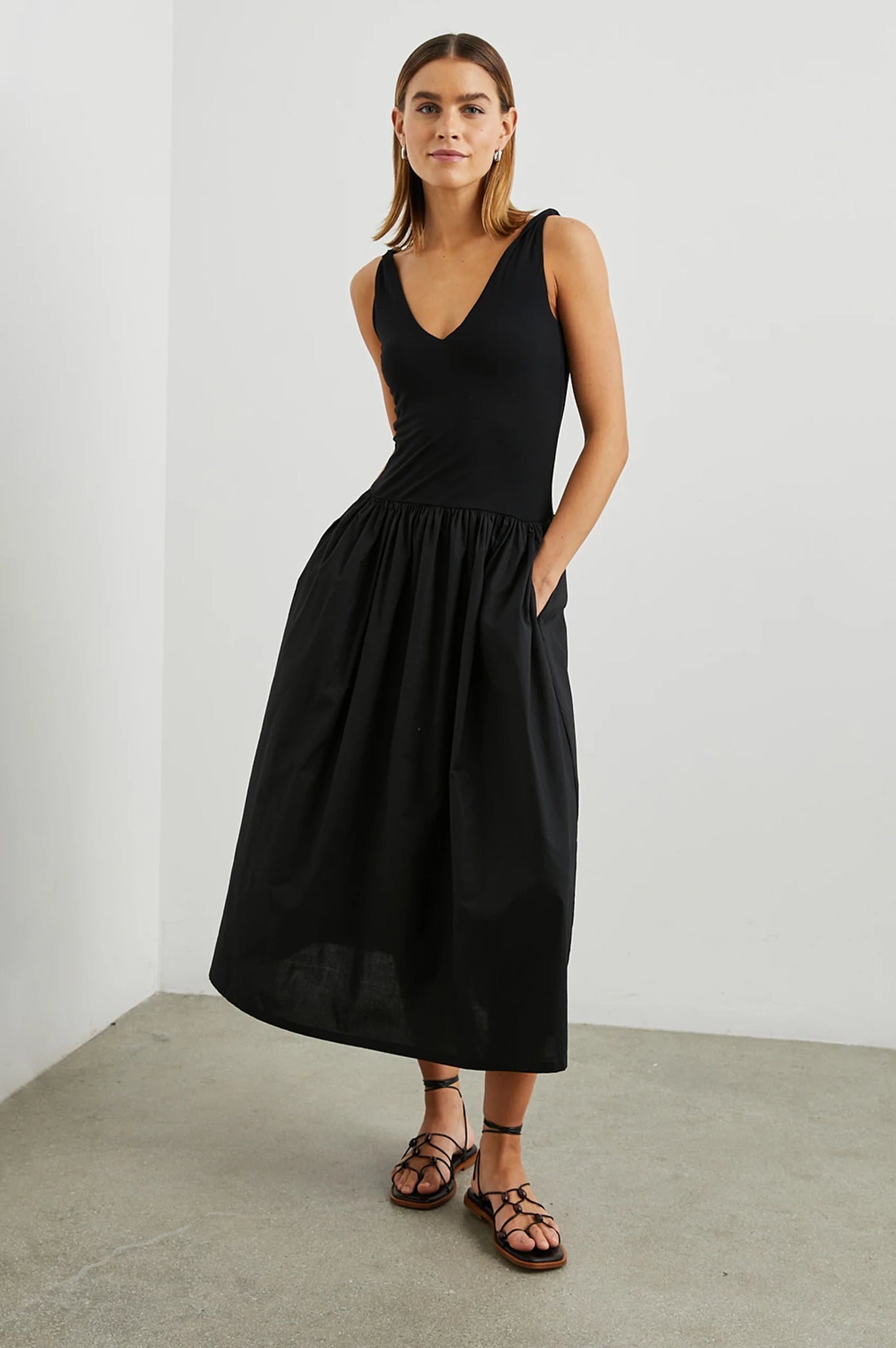With an emphasis on effortless elegance, the Franca Dress combined a jersey cotton bodice with a poplin skirt for all-day comfort. Featuring a deep-v neckline and dropped waist to flatter your curves, as well as on-seam pockets for convenience, this midi-dress is a must for the modern woman on the go.