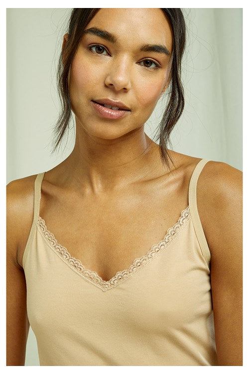 Slip dress in Almond shade with feminine lace trim and adjustable straps, suitable for lounging, sleep or wearing as a base layer.