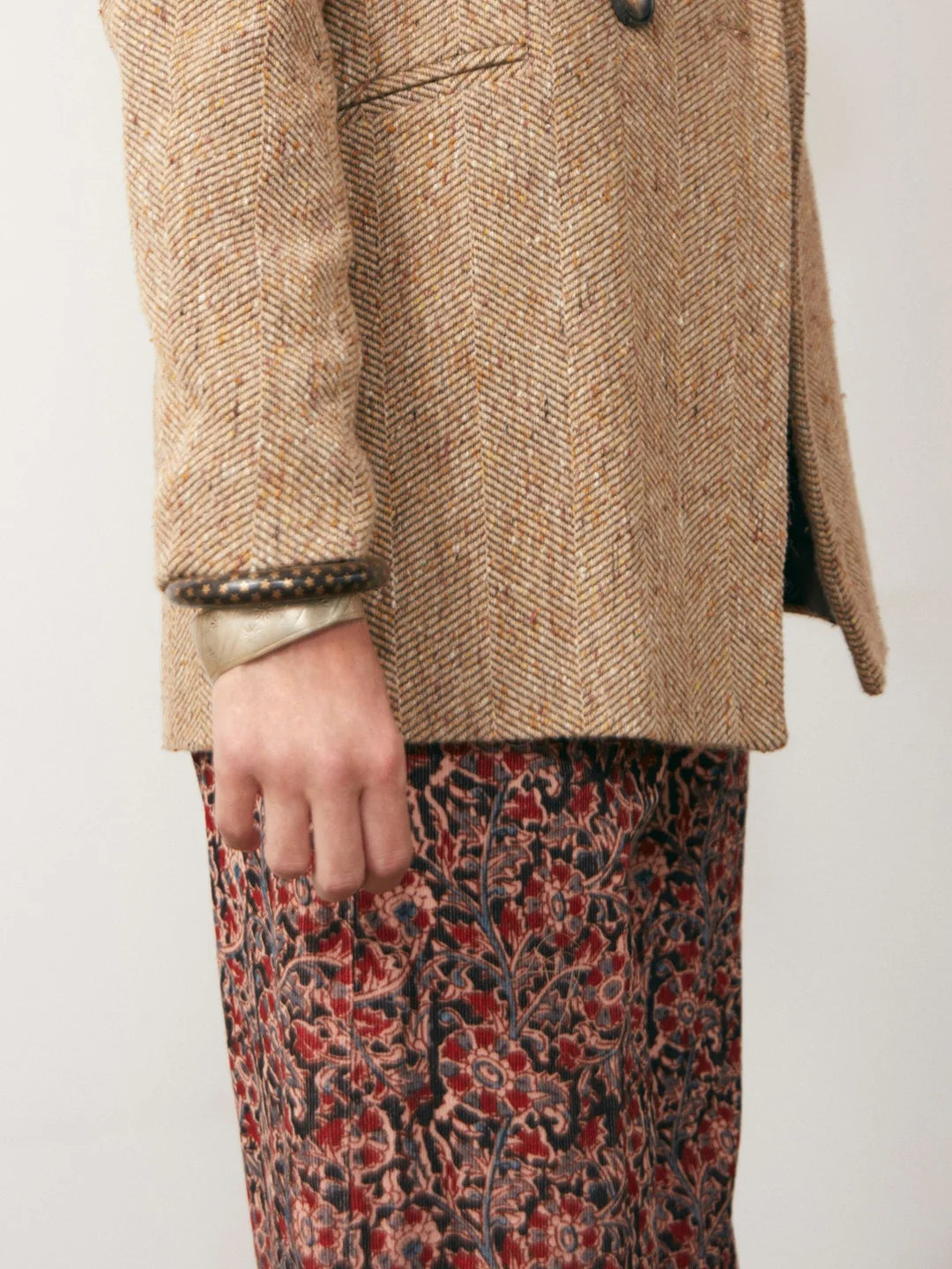 Double breasted with collar, straight cut and long tapered sleeves. Featuring two side pockets as well as one chest pocket. What makes it stand out is its Bourbon color to warm your soul.