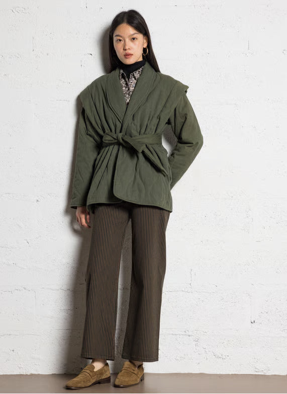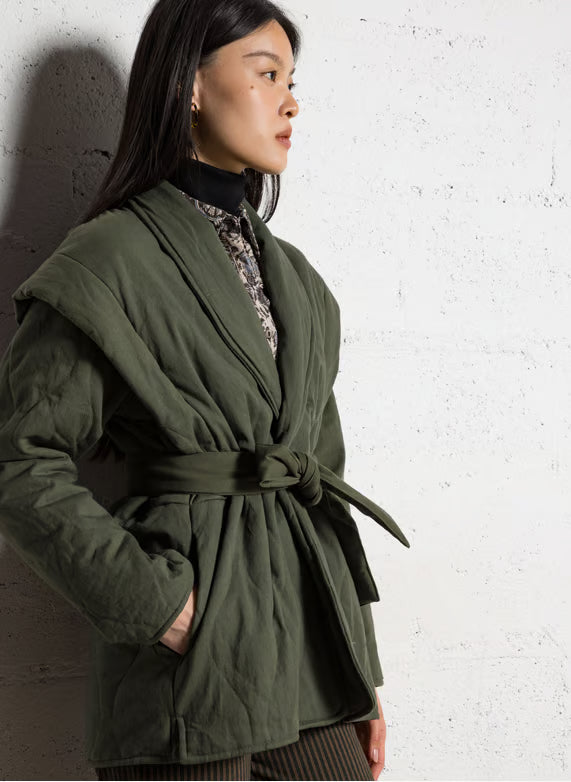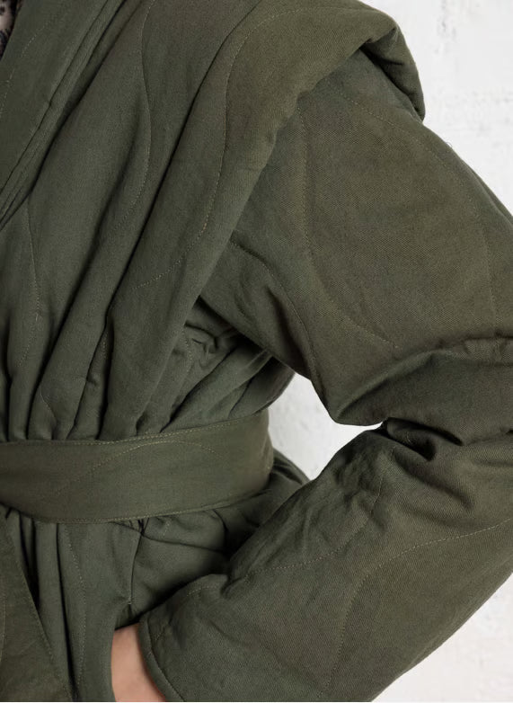 Olive bloom quilted, wrap jacket with raised shoulder detailing.