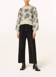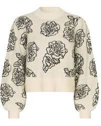 This cropped jumper features a crew neck and slight gathering at the wrists. Creme embroidered flower print.