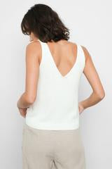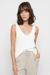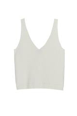 Midweight, textured crochet knit, sleeveless, neutral cream v-neck tank top featuring swingy relaxed fit, relaxed neckline, v-back detail, and ribbed detail at hem. Super lightweight and flattering, this tank top is perfect for everyday wear.