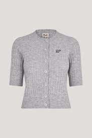 This soft, knitted cardigan features large button closures, short sleeves, and a ribbed texture.