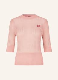 This thin knit top features three quarter-length sleeves, a ribbed texture, and an embroidered logo at the chest. Available in peach pearl.