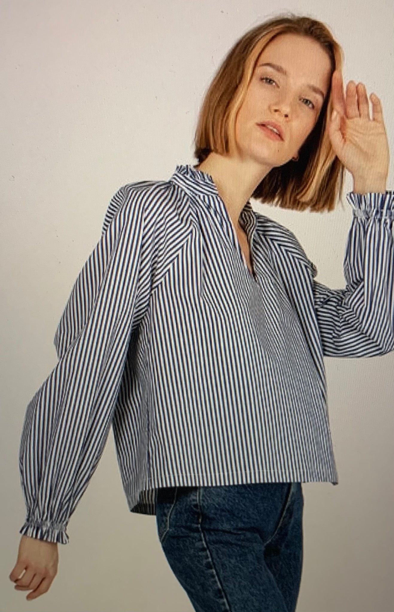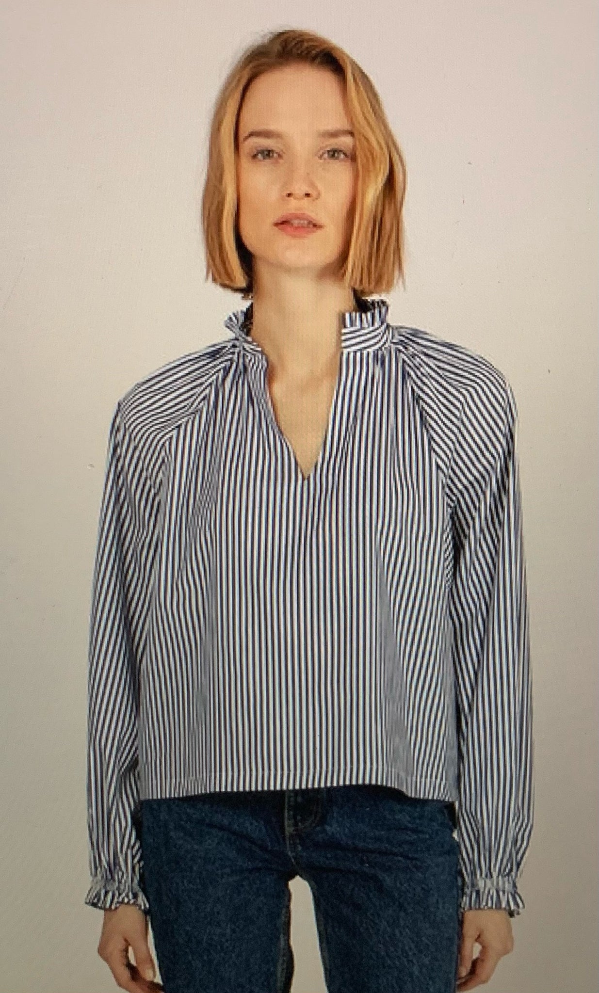 Navy and white striped, 100% cotton. Mock collar with V neck and cinched wrists.