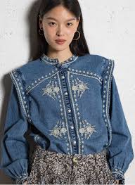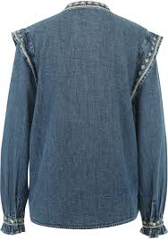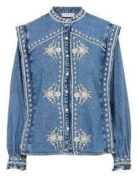Soft denim blouse with gorgeous embroidery - neck, wrists, chest. Snap button closure and shoulder detailing.