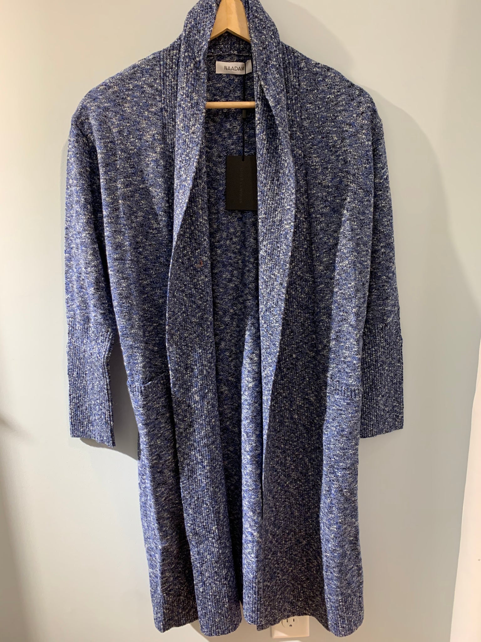 Marbled navy, this is sure to keep you warm and cozy. Perfect length with a shawl like drape collar.