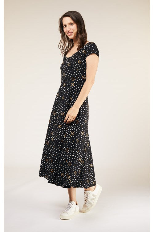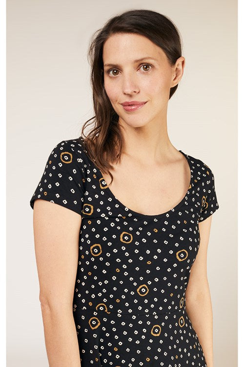 Our Carly Shibori Dress in organic cotton jersey is essential warm weather dressing. With cap sleeves and a scoop neckline on the fitted bodice, over a swishy midi-length skirt, this dress has everything you need to stay cool while the sun shines. Available in black multi.